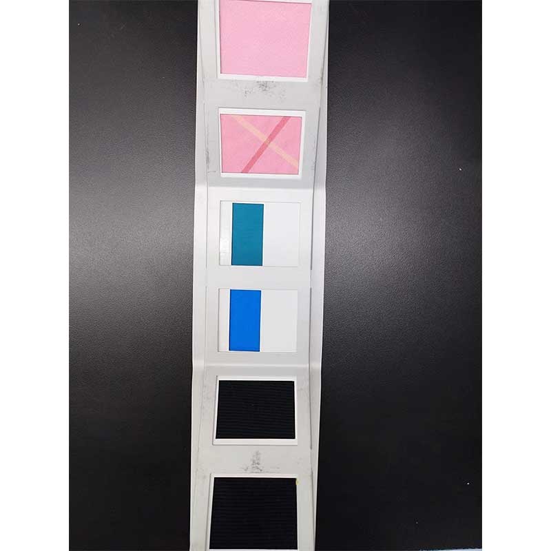 紡織品試樣與一組藍色標準布一起在人造光源下按照規定條件曝曬,然后將試樣變色與藍色標準布變色進行比對,評定色牢度。其中最常見的是JIS L 0842:2021(第3露光法):裁取試樣時要使所有顏色都包含在照射面積內,將裝有試樣和藍色標準布的試樣架固定在耐光機上。直至3級或者4級藍色標準布照射達到標準變色程度(與評定變色用灰色樣卡的4級色差程度相同),將試樣與達到標準變色的藍色標準布比較,進行評級。