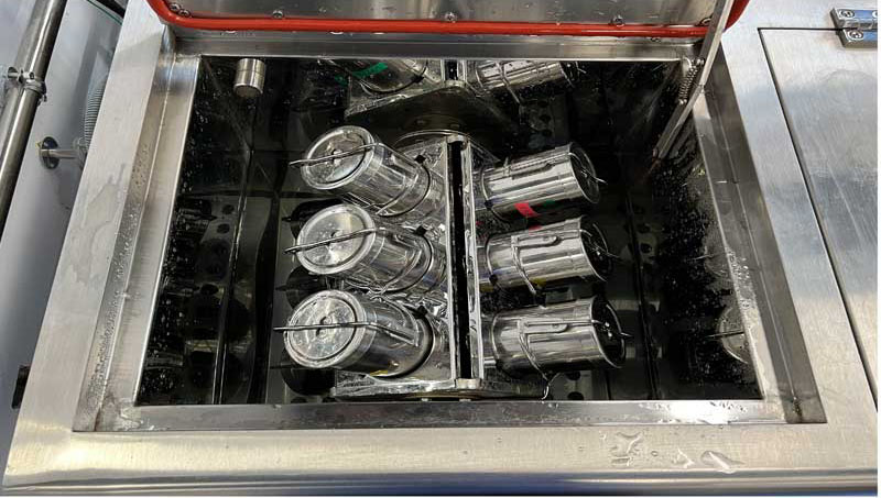 測試時使用洗滌試驗儀,在洗滌罐中加入干洗溶劑(A-1法:四氯乙烯,B-1法:將石油溶劑(工業汽油5號)和復合試樣(試樣和兩種附加白布縫合的狀態)、20個不銹鋼球一起放入,密封后,在30℃的試驗液中處理30分鐘。然后漂洗、干燥,分別判斷試樣的變退色和對添加白布的污染程度。另外,附加白布不是單一布,而是使用多纖維交織布(多纖維交織1號),以其污染最嚴重的部分為判定等級。